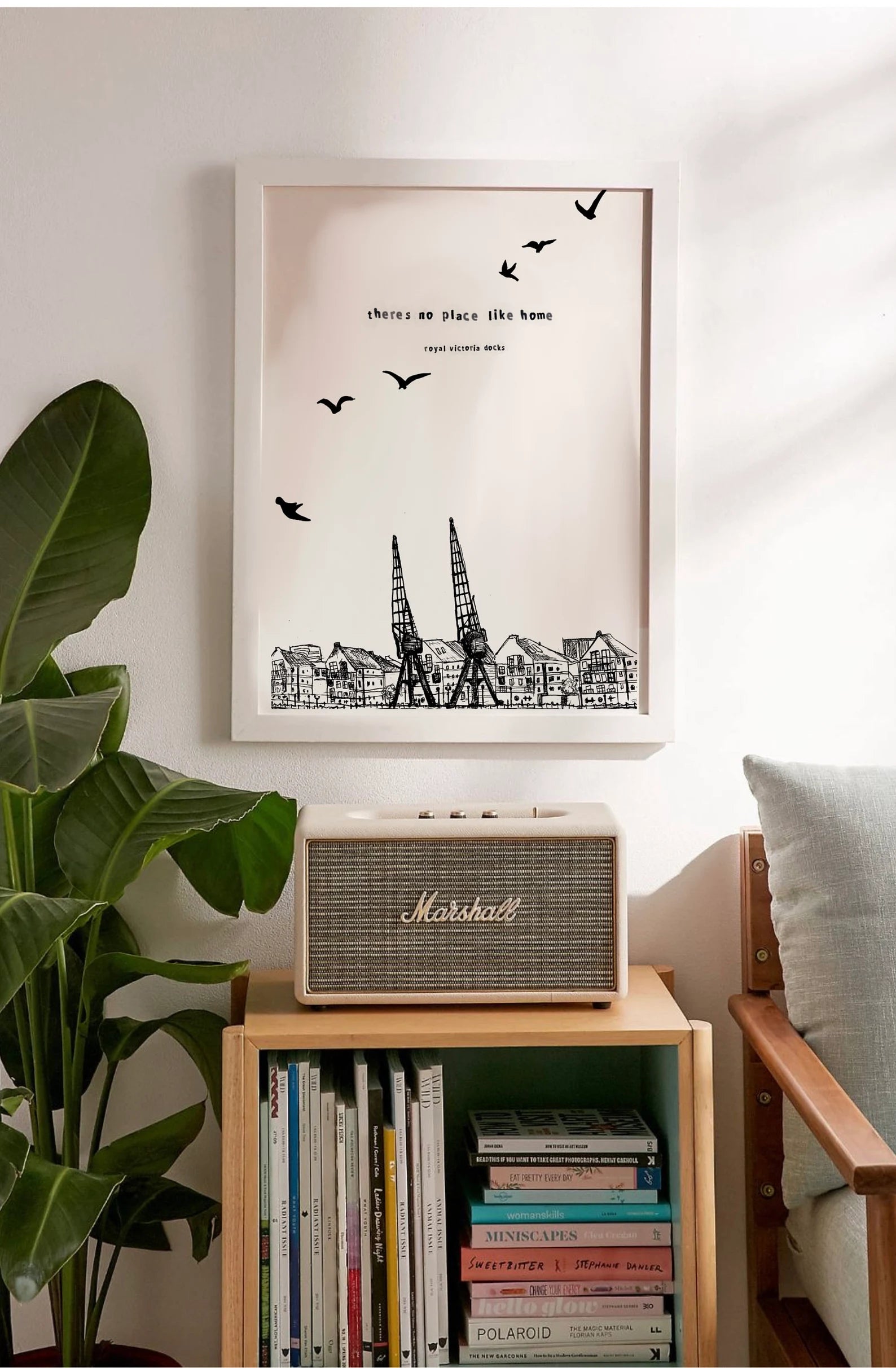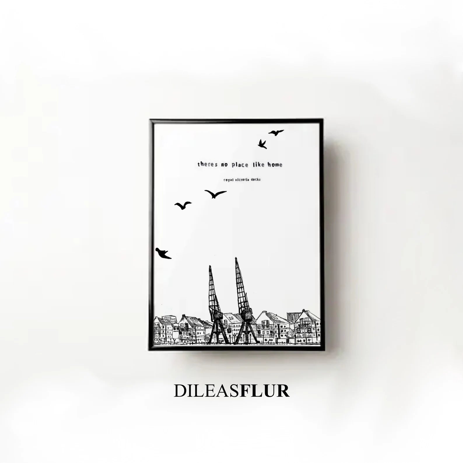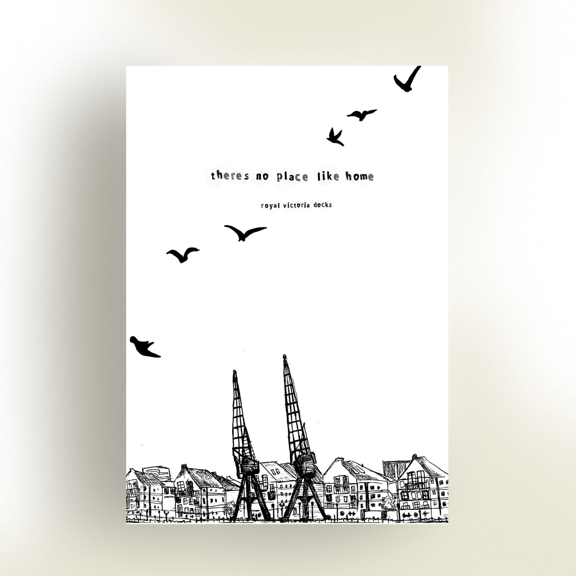 "Victoria Docks" art print: A minimalistic black and white line drawing that captures the charm of the houses along the river bank in the historic Royal Victoria Docks. Part of a collection exploring the artist's home and surroundings, this print embodies a sense of place and nostalgia. With the slogan "There's no place like home," it becomes a meaningful addition to any space, celebrating the rich history and unique character of the Royal Victoria Docks. Elevate your decor with this stylish homage to a cherished locale.